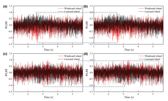 Figure 15 shows the time-varying WLRR values of the first wheelset of the leading car and the last wheelset of the trailing car of the train, with and without the given posture. According to the definition of WLRR, its theoretical maximum value is +1, which means that the wheel–rail contact force is 0 and the wheel–rail disengagement state is at this time, so the maximum value of WLRR cannot exceed 1. However, its lowest value is not −1. In the process of high-speed train operation, if there is irregularity on the rail surface (the rail surface is slightly arched upwards) or a transient aerodynamic impact at a certain moment. The wheels will have a transient impact on the rail, where the impact force can even reach several times the static wheel weight, which is why WLRR can reach a value higher than −1.