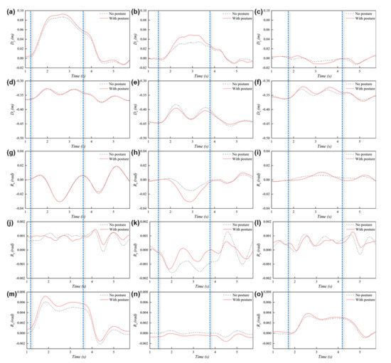 Figure 16m–o, the influence of a given posture on the yawing angle is clear and simple, which made the positive yawing rotation of the leading and trailing cars larger and increased the negative yawing rotation of the middle car in reverse.