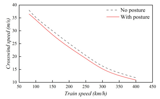 Figure 17 shows the running safety domain in terms of the relationship between the speed of crosswind and train. A train’s critical speed is higher when there is a weaker crosswind, and it is lower when there is a stronger crosswind. The train’s ability to overcome crosswind decreases as it speeds up. With the consideration of posture, a train is proven to withstand a weaker crosswind. As a result, for high-speed and super-speed trains, extra attention should be given to the wind environment.