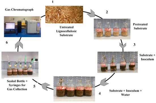 The Biochemical methane potential (BMP) assays were used, triplicate batch fermentation tests were carried out, depicted in Figure 1 [23]. Two batch experiments were performed in parallel for a substrate to inoculum (S/I) ratio of 1.5 and 2.5.
