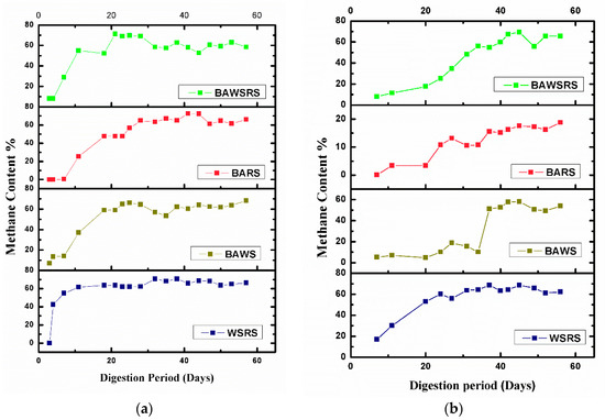 Methane % Potential of Reactors with (S/I ratio) (a) 1.5 and (b) 2.5.
