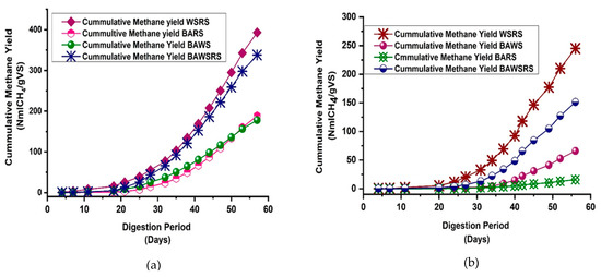 Cumulative Methane Yield (NmLCH4/gVS) of S/I ratio, (a) 1.5 and (b) 2.5.