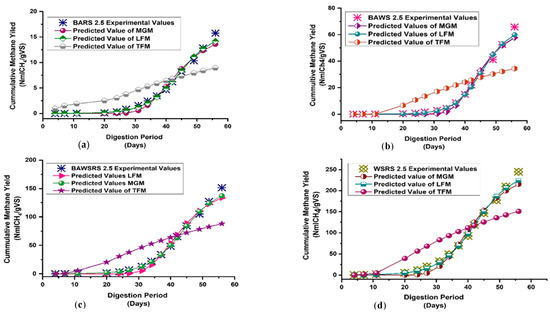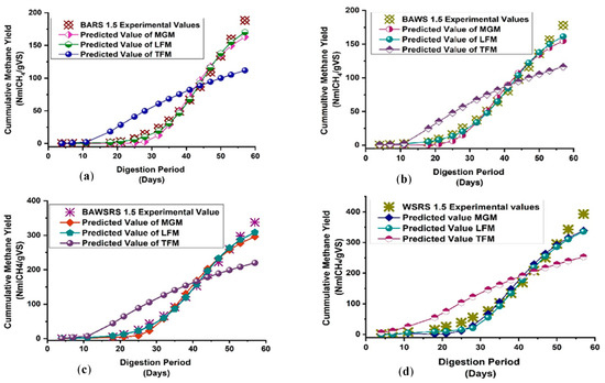 Considering the lag phase of all reactors in both experiments, the lowest lag phase was observed for the Reactor WSRS due to lower lignin content. The maximum methane production rate (Rm) increased with the decrease in the lag phase, and this is due to the pretreatment, which breaks the structure of lignocellulosic material and makes room for the acetogenic and methanogenic bacteria [47] The soundness of the modified Gompertz model depends on the bio-kinetic parameters, and these parameters, analyzed by Modified Gompertz Model, exemplifies a lower methane production with a longer lag phase due to an increase in substrate concentration, the more substrates concentration, the longer the hydrolysis phase would be. R2 values illustrate that the predicted model was fitted with the experimental values that are shown in Figure 4 and Figure 5. LF and GM models have almost similar values, but the difference between the predicted model and experimental values was nearly equal to 10% or more than 10%; that is why GM was not considered as the best fit [48].