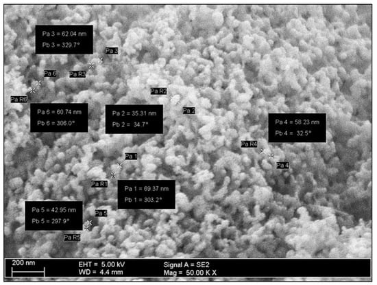 The SEM image of the silica aerogel sample at 50,000× magnification is presented in Figure 4. The image indicates that the sample has no definite form, with the silica particles forming aggregates with each other. It has a porous structure with the aggregates formed by spherical particles, with an average size of 54.77 nm.