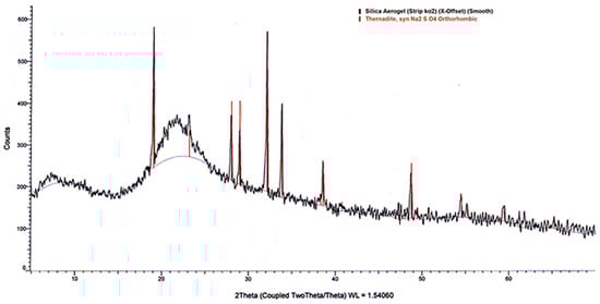 The XRD pattern of the silica aerogel sample as shown in Figure 5 reveals the presence of humps at the low-angle region together with narrow and sharp peaks, hence indicating that the sample is moderately amorphous. Furthermore, the analysis revealed the presence of silica gel as the main constituent, as well as thenardite, which is an anhydrous sodium sulfate (Na2SO4), as indicated by the red line.