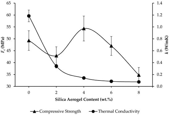 Figure 6 presents the Fc and k, at 28 days of curing, of the composite cement paste samples that contained varying silica aerogel content. Fc decreased from 49.28 MPa to 42.89 MPa when the silica aerogel content per sample was increased from 0 wt.% to 2 wt.%. Conversely, a further addition of 2 wt.% of silica aerogel per sample, which was from 2 wt.% to 4 wt.%, led to the culmination of Fc at its highest value of 54.33 MPa. As the silica aerogel content was increased from 4 wt.% to 6 wt.% and then 8 wt.%, Fc was adversely affected, where Fc decreased from 54.33 MPa to 47.03 MPa and then its lowest value of 34.77 MPa, respectively. A similar trend of Fc was reported in Bostanci et al. []. Furthermore, it can be projected that the adverse effect on Fc will extend as higher amounts of silica aerogel are incorporated, as revealed in Ng et al. []. In essence, the incorporation of 8 wt.% of silica aerogel led to a loss of strength of 29.44%, where Fc decreased from 49.28 MPa to 34.77 MPa. On the other hand, the incorporation of silica aerogel led to a drop in k from 1.185 W/mK to 0.340 W/mK, 0.142 W/mK, 0.086 W/mK, and 0.076 W/mK when 2 wt.%, 4 wt.%, 6 wt.%, and 8 wt.% of silica aerogel were incorporated, respectively. Essentially, the incorporation of 8 wt.% of silica aerogel resulted in a decline in k of 93.59%, with a gradient that decreased as the silica aerogel content was increased. In view of the culmination of Fc at its highest value of 54.33 MPa that coincides with the conspicuous decrease in the gradient of k as it declined from 1.185 W/mK to 0.142 W/mK, it can be deduced that the silica aerogel content of 4 wt.% resulted in the optimum formulation of the silica-aerogel-incorporated composite cement paste.