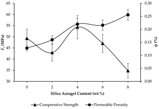 Figure 7 shows that the increase in the silica aerogel content in the composite cement paste increased its ϕ, which was due to the nano-sized pore structure of silica aerogel. The ϕ of the cement paste, without the incorporation of silica aerogel, was 0.128%. The incorporation of 2 wt.% of silica aerogel in the cement paste induced a rise in ϕ from 0.128% to 0.160%. Further addition of silica aerogel from 2 wt.% to 4 wt.%, 6 wt.%, and 8 wt.% led to the increase in ϕ to 0.220%, 0.216%, and 0.256%, respectively. The increase in the silica aerogel content beyond 4 wt.% led to the sharp decline in Fc from 54.33 MPa to 34.77 MPa due to the high ϕ of 0.256%. However, when the silica aerogel content was increased from 2 wt.% to its optimum value of 4 wt.%, the Fc improved from 42.89 MPa to 54.33 MPa in spite of the increase in porosity from 0.160% to 0.220%.