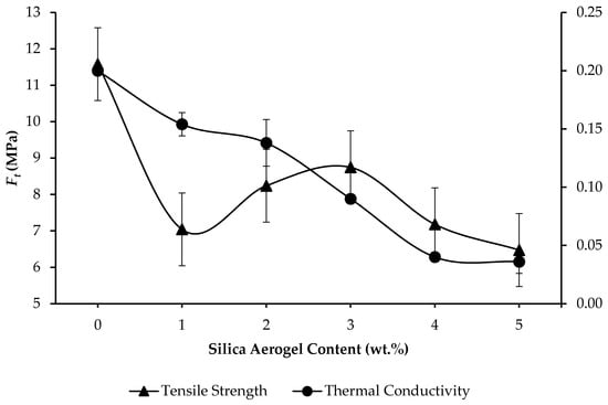 Figure 8 presents the Ft and k of the composite insulation samples that contained varying silica aerogel content. The highest Ft of 11.58 MPa was obtained for the composite insulation sample that was not incorporated with silica aerogel. The Ft decreased sharply to 7.04 MPa when 1 wt.% of silica aerogel was added. Contrarily, further increments in the silica aerogel content from 1 wt.% to 2 wt.%, and then 3 wt.%, resulted in the improvement of Ft from 7.04 MPa to 8.24 MPa, and then 8.74 MPa, respectively. However, further additions of silica aerogel beyond 3 wt.% induced a decline in Ft from 8.74 MPa to 7.18 MPa, and then 6.47 MPa, for the samples with silica aerogel contents of 4 wt.% and 5 wt.%, respectively, due to the agglomeration of the silica aerogel particles, which affected the strength and elongation of the sample, according to Zolfaghari et al. [] and Thongpin et al. []. As for k, a gradual decrease was observed with each increment in silica aerogel content. The sample that was not incorporated with silica aerogel obtained the highest k of 0.20 W/mK, which then declined to 0.15 W/mK, 0.14 W/mK, 0.09 W/mK, 0.06 W/mK, and then 0.04 W/mK when the silica aerogel content was increased to 1 wt.%, 2 wt.%, 3 wt.%, 4 wt.%, to 5 wt.%, respectively, with a percentage in overall decline of 80%.