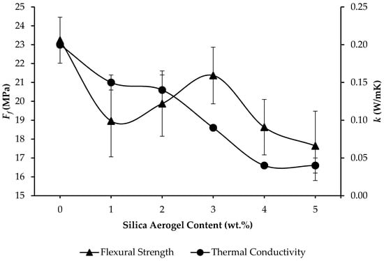 Figure 9 shows the Ff and k of the composite insulation samples that contained varying silica aerogel content. The highest Ff of 23.24 MPa was obtained for the control sample, which was not incorporated with silica aerogel. Increment of silica aerogel from 0 wt.% to 1 wt.% resulted in a decrease of Ff from 23.24 MPa to 18.96 MPa. Conversely, the Ff increased from 18.96 MPa to 19.88 MPa, and then 21.37 MPa, when the silica aerogel content was increased from 1 wt.%, to 2 wt.%, and then to 3 wt.%, respectively. Subsequently, the Ff decreased from 21.37 MPa, to 18.63 MPa, and then to the lowest Ff of 17.64 MPa when the silica aerogel content was increased from 3 wt.%, to 4 wt.%, and then to the highest silica aerogel content of 5 wt.%, which is due to the high ϕ of the silica aerogel that resulted in its lower mechanical performance as mentioned in Wucherer et al. [], and also the impact of further adding silica aerogel that tends to reaggregate instead of spreading homogeneously throughout the HDPE-kapok fiber matrix [], leading to a decrease in the interaction between the surface area of the silica aerogel with the HDPE and kapok fiber as highlighted in Mazlan et al. [], and, as a consequence, caused the sample to be more brittle due to ineffective stress transfer. Although k greatly decreased with the incorporation of silica aerogel in the composite insulation, the silica aerogel content of 3 wt.% is recommended to formulate a composite insulation that concurrently possesses low k with reasonably high Ft and Ff.