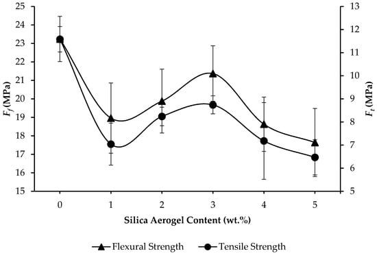 Unlike tensile strength tests where stress is distributed along the sample, the stress in flexural strength test is more restricted to the region of the applied load. Figure 10 compares the Ft and Ff profiles of the composite insulation samples with varying silica aerogel content. Notwithstanding the minor difference between the gradient of the declines of Ft and Ff when the silica aerogel content was increased from 0 wt.% to 1 wt.%, where the decline of Ft was sharper than that of Ff, profiles of Ft and Ff exhibited similar trends and is in agreement with the findings in Shahroze et al. [], hence validating the consistency in the preparation of corresponding samples that were employed to perform the tensile and flexural strength tests.