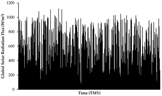 Global solar radiation flux throughout the TMY at the location of the BIM.