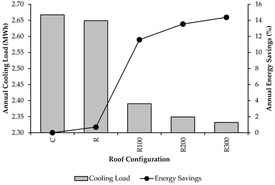 Figure 14 reveals the annual cooling load and energy savings of the indoor environment of the BIM at varying roof configurations of C, R, R100, R200, and R300. The annual cooling load of C was 2.6671 MWh, and it was marginally reduced to 2.6488 MWh when the 20-mm silica-aerogel-incorporated composite cement paste was applied as render on the roof-top surface to form R, hence generating an annual energy savings of 0.6909%. Furthermore, when a 100-mm thick silica-aerogel-incorporated composite insulation board was installed below the roof tiles of R to form R100, a sharp drop in the annual cooling load to 2.3903 MWh, with an annual energy savings of 11.5801% relative to C, was observed. Additional increments to the thickness of the insulation board to 200 mm, and then 300 mm, resulted in further reductions in the annual cooling load to 2.3491 MWh, and then 2.3319 MWh, with annual energy savings of, relative to C, 13.5371%, and then 14.3745%, respectively. The highest gradients, based on their absolute values, in the decline in the annual cooling load, and the rise in the annual energy savings, were observed when the 100-mm thick insulation board was installed to R. Therefore, the application of the 20-mm cement render, coupled with the installation of the 100-mm thick insulation board, is recommended as the optimum roof configuration.