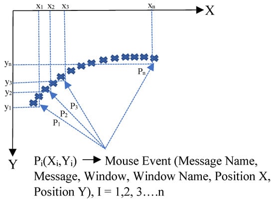 A mouse movement action is a set of sequential user actions that represents a movement of the mouse between two screen locations. The screen object contains information about the event position. Figure 2 shows a mouse action, which consists of n events represented as a sequence of n points: {P1, P2, P3, ..., Pn} [22].