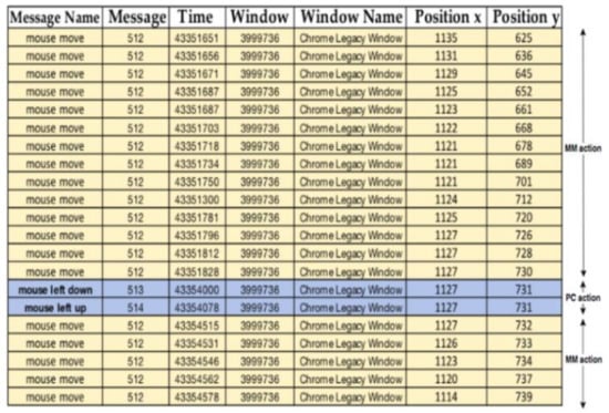 On the basis of the previous literature review, we divided the dataset of mouse actions into the three types of actions defined by Ahmed and Traore, namely, MM, PC, and DD [1]: MM describes a mouse movement between two screen locations; PC is a point-and-click, moving the mouse to a point and then clicking one of the mouse buttons; and DD is a drag-and-drop, a mouse drag movement initiated by pressing the primary mouse button and concluded by releasing it. In this study, the data of mouse actions were divided into two categories: (A) mouse movement, and (B) point-and-click action (press action and release action). The team consider an action as a point-and-click (PC) action when the previous event of a mouse is a mouse down and then mouse up; otherwise, it is a segment of data as a mouse movement (MM) action. Two complete segments of actions are shown in Figure 3.
