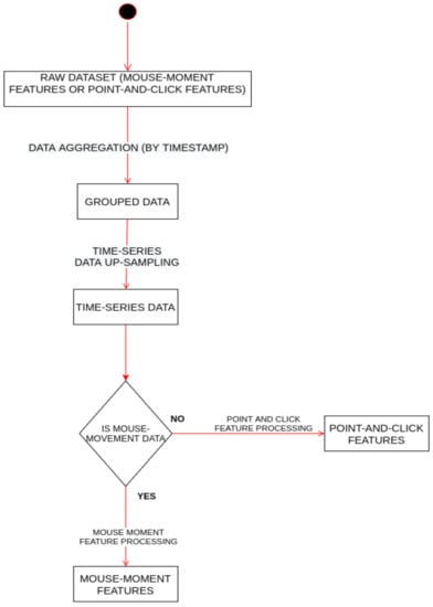 Feature extraction of mouse movement features and point-and-click features requires pre-processing and transformation of movement data into continuous time-series data. Continuous time-series data are generated from grouping the data by taking a Unix-timestamp column (“Time”, in our case) as the grouping key so that a single Unix-timestamp can be linked to one or more records. At every Unix timestamp available in the dataset, the position at the x-axis is grouped and the mean is calculated. Similarly, the position at the y-axis is grouped with its respective timestamp, and the mean is calculated for the entire group of values belonging to a unique Unix timestamp. At the start of the processing of raw data, either mouse moment data or point click data are chosen. These data are grouped using timestamp as a key, and data aggregation is applied. These time-series-aggregated data are then resampled/up-sampled to make the dataset continuous. The sample time-series data are passed through a feature processing and extraction pipeline, which is specific to the type (mouse moment or point click) of data chosen in the first step. In the final step, we get hold of the required features that can be used for ML model training or data analysis. Figure 6 shows the steps of the data preprocessing.