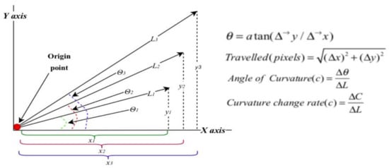 Curvature distance is a ratio of distances in three consecutives recorded points on the screen. When a change in angular of the tangent per pixel divided by the length of the path from the origin point is found, the angle of curvature is computed (Figure 7). It can be calculated by the following Equation (13):
