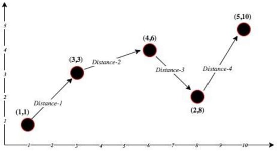 In addition, the length of the trajectory was computed between all sequence of points belonging to the trajectory. In Figure 9, the total trajectory length would be equal to sum of distance1 + distance2 + distance3 + distance4, where “distance” here refers to Euclidean distance. The length of the trajectory was computed using the following Equation (17):
