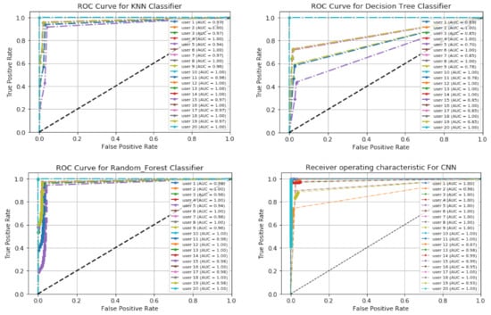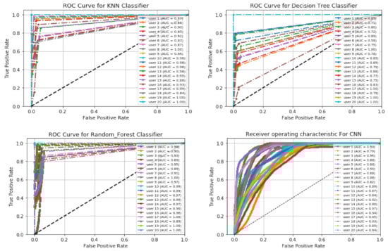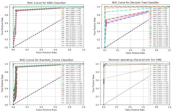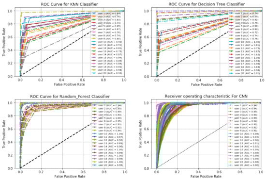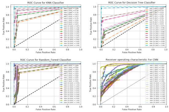 This section evaluates the performance of each classifier on the basis of results achieved in the continuous authentication phase and in the anomaly detection phase. The performance of each method is measured using three common metrics: false acceptance rate (FAR), false rejection rate (FRR), and equal error rate (EER). FAR is the probability that a user who should be rejected is accepted by the system. FRR is the probability that a user who should be accepted is rejected by the system. EER is a threshold value between the false acceptance rate and the false rejection rate. Another important evaluation tool to examine the classifiers and show the performance of the biometric system is to plot the receiver operating characteristic (ROC) curves. It is important to interpret a classifier with the structure of its ROC curve because they show the prediction success of the models on several operating points corresponding to all possible thresholds. The ROC curve plots the true positive rate (TPR) against the false positive rate (FPR) [38]. The following expressions were used for performance evaluation purposes [39]: TP: true positive, TN: true negative, FP: false positive, FN: false negative, FAR: false acceptance rate, FRR: false rejection rate, and EER: equal error rate: