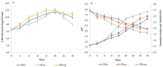 The colony counts of the selected LAB cultures, starting from the value of 6.5 log cfu/mL, increased during the 30 days of the fermentation trials. The highest value of 12 log cfu/mL was reached in the samples fermented with the mixed culture (FB-lcsp), after 20 days of fermentation. Later, the LAB population decreased, and the final values detected were 11, 10 and 8 log cfu/mL for FB-lcsp, FB-lc and FB-sp, respectively (Figure 1a). A substantial decrease of the pH and a corresponding increase of the titratable acidity was observed during the fermentation process (Figure 1b). The lowest pH value (3.7) and the highest TA value (3.4 mL NaOH 0.1N) were assessed for the FB-lcsp samples.