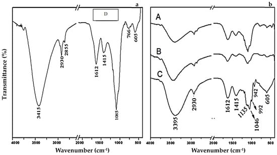 In particular, the infrared spectrum analysis of the polysaccharides, recorded for wavelengths 500–4000 cm−1, showed an intense peak between (3415–3395 cm−1), representative of the vibrations of the hydroxyl groups (-OH), followed by a weak vibration of the C-H band at 2930 cm−1 [54]. Peaks with vibration bands between (3415–2930 cm−1) are unidentified organic groups (Figure 2a). The peak at 1612 cm−1 is attributed to the vibration of the C = O group in its protonated carboxylic form. The peak at 1415 cm−1 is attributed to the vibration of the COO- group in its deprotonated carboxylic form polysaccharide extract [55]. Moreover, the peaks detected at 1200–1000 cm−1 indicate that the fractions are pyranose forms of carbohydrate [56]. The peaks with vibration bands at 992 cm−1 and 942 cm−1 (Figure 2b) derive from the antisymmetric stretching of tetrahydropyran, suggesting the presence of an arrangement in the carbohydrate units [57]. The peak at 605 cm−1 is related to D-glucopyranose. Additionally, the vibration at 766 cm−1 is related to rhamnoside present in the polysaccharide. The functional groups, such as –OH, –COOH and C=O, largely found in carbohydrate in addition to anionic and cationic groups, have a good ability to counteract oxidative stress, which is expressed by excessive production of reactive oxygen species [58].