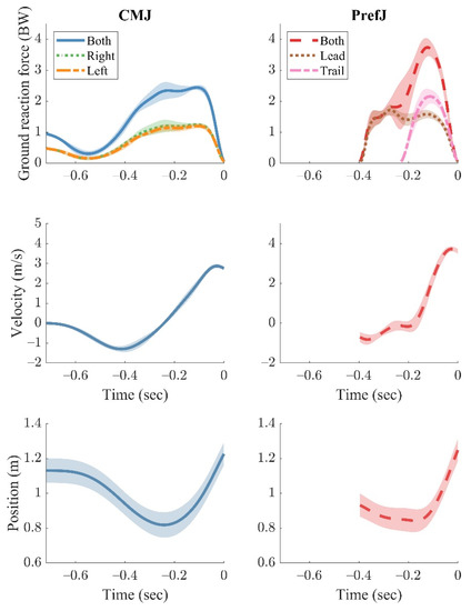 Discrete peak variables were extracted from each jump trial. For the CMJ, peaks were extracted during the movement phase, which was defined as the time interval between when the summed vertical GRF fell below 95% of body weight and when both feet left the ground (i.e., summed vertical GRF < 10 N) (Figure 2). For the PrefJ, peaks were extracted during the ground contact phase, which was defined as the time interval between when the lead foot made contact with the first force plate and when both feet left the ground (i.e., summed vertical GRF < 10 N). Vertical jump height was calculated from the vertical velocity at the instant of take-off. The difference between vertical pelvis position at the beginning of each respective jump and at its minimum was used to represent the COM displacement during the lowering phase. The discrete peaks from each type of jump were averaged across trials to create within-subject averages, which were then used for statistical analysis. For the CMJ, data from the left and right leg were further averaged together into a bilateral average value. In contrast, for the PrefJ, data from the lead and trail legs were kept separate and considered as distinct observations.