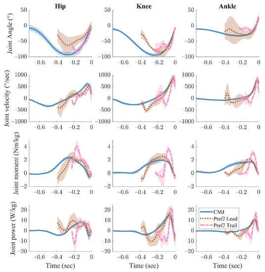 The statistical analysis showed that peak hip and knee flexion angles of the lead leg and peak ankle dorsiflexion angles of the trail leg were smaller during the PrefJ than during the CMJ (Table 2). In contrast, peak hip extension velocities were smaller and peak knee extension velocities were greater during the PrefJ than during the CMJ (Table 2).