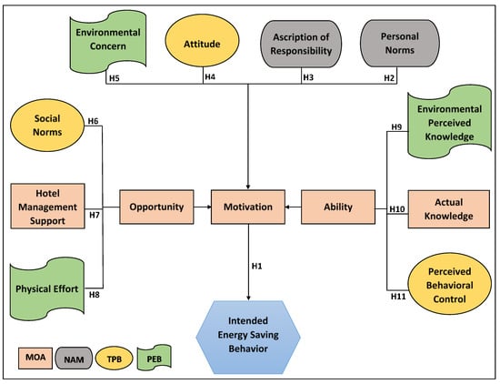 In this section, the energy-related behavior models (i.e., Motivation-Opportunity-Ability, Norm Activation Model, Theory of Planned Behavior, and Pro-environmental Behavior) are identified to design the integrated framework of this study. The energy-related behavior models are incorporated to provide a comprehensive and holistic approach to identifying hotel guests’ energy-use behavior. The proposed framework assigned Motivation-Opportunity-Ability (MOA) model to act as a moderator for the other three energy-related behavior models: Norm Activation Model (NAM), Theory of Planned Behavior (TPB), and Pro-environmental Behavior (PEB). The three main categories of the MOA model (i.e., Motivation, Opportunity, and Ability) are designed to have high impact on intended energy saving behavior in this study. To accurately define and measure the components for each of the three levels of MOA, the authors adopted categories from the aforementioned energy-related behavior models (i.e., NAM, TPB, and PEB) to identify the energy-use behaviors of hotel guests, based on a comprehensive literature review of the hospitality industry and social psychology.