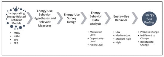 Many studies have proposed energy-related behavior models to understand the factors that influence human energy-use behavior [7,21,22]. The models that have been used in this research are: (1) Motivation-Opportunity-Ability (MOA) (e.g., [8,23]); (2) Norm Activation Model (NAM) (e.g., [8,24,25]); (3) Theory of Planned Behavior (TPB) (e.g., [8,26,27,28]); (4) Pro-Environmental Behavior (e.g., [29,30,31,32]). A detailed description of each model from literature is provided below.