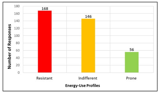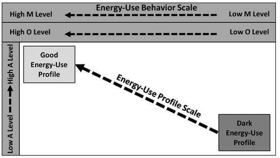 In this section, the energy-use profiles of the hotel guests (i.e., energy-use survey participants in this study) are determined and divide them into energy-use profile groups (e.g., dark energy-use profile and good energy-use profile). The energy-use profiles of hotel guests are determined based on a template of energy-use profile matrix (see Figure 3) adopted from [20]. This matrix is utilized to identify the energy-use profiles of hotel guests. For example, if a hotel guest has Low energy-use behavior Motivation (M) level, Low energy-use behavior Opportunity level, and Low energy-use behavior Ability (A) level, the guest will be identified to have dark energy-use profile. Moreover, if a hotel guest has High energy-use behavior Motivation (M) level, High energy-use behavior Opportunity level, and High energy-use behavior Ability (A) level, the guest will be identified to have good energy-use profile. Further, if a hotel guest has Low energy-use behavior Motivation (M) level, Low energy-use behavior Opportunity level, and High energy-use behavior Ability (A) level, the guest will be identified to have dark energy-use profile because the guest’s energy-use profile will still be in the dark energy-use profile zone.