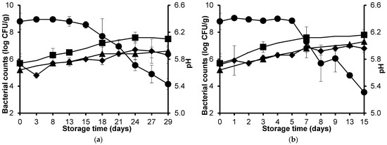 Bacterial counts of TVC (■), LAB (▲), L. monocytogenes (♦), and changes in pH (●) during storage of an RTE cooked, cured meat product inoculated with a cocktail of L. monocytogenes serotypes. (a) Storage of the meat product at 4 °C; (b) storage of the meat product at 10 °C. Symbols and error bars represent the average value and standard deviation, respectively, of three replicates.