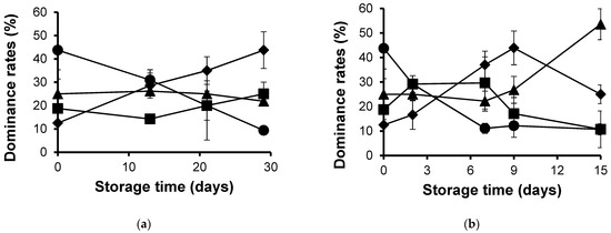 Dominance rates for L. monocytogenes serotypes 1/2a (■), 1/2b (▲), 1/2c (♦), and 4b (●) during storage of an RTE cooked, cured meat product inoculated with a cocktail of L. monocytogenes strains. (a) Storage of the meat product at 4 °C; (b) storage of meat product at 10 °C. Symbols represent the dominance rates for the respective L. monocytogenes serotype on each sampling day, calculated through Equation (1) (see the text). Serotyped L. monocytogenes strains on each sampling day originate as the result of pathogen isolation from the three replicates performed and the subsequent differentiation by mPCR; the error bars represent the standard deviation of these three replicates.