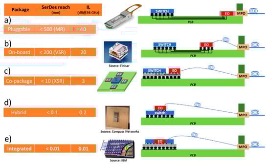 This approach is in-line with the industry’s long-term goal of integrating photonics and digital electronics, shown in Figure 1. Starting with pluggable transceivers, the optical interconnect is moved closer to the ASIC with each generation until full integration (Figure 1d,e) will be obtained. On-board (Figure 1b) optics technologies have been widely investigated with several reported demonstrations, including from Intel, Luxtera, Elenion and others (see [12,13,14,15] and references therein). Co-packaging (Figure 1c) is thus the next step after on-board optical engines.