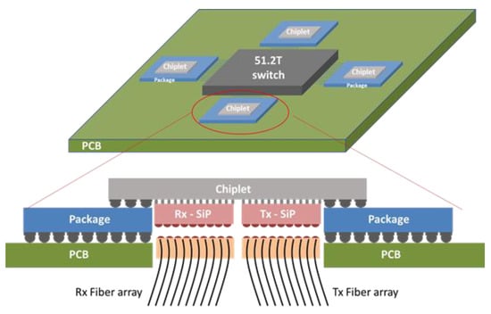 The front panel pluggable transceivers are rearranged into large, 2D SiP matrices that are assembled directly on each chiplet. Using 25 Gb/s per lane, each transmitter cell in a 64 element SiP matrix contains a 25 G modulator and a laser source. The modulated signals from 4 adjacent cells are Coarse Wavelength Division Multiplexed (CWDM) and fiber coupled. The laser source can be integrated within the SiP cell or may be fiber-coupled from an external laser bank. In the former case, the laser may suffer from thermal instability due to the proximity to the very hot switch, while in the external source case, a higher loss is anticipated due to the two additional coupling steps. A receiver SiP matrix is assembled next to the transmitter SiP matrix with integrated photodiodes and wavelength de-multiplexing for every 4 cells.