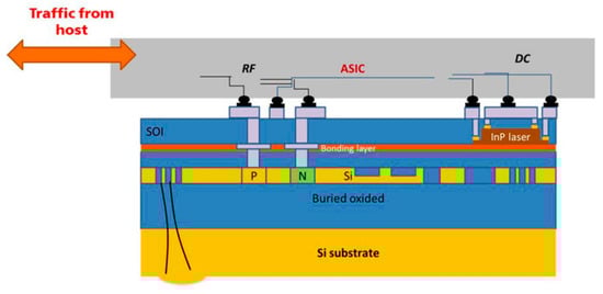 A second limitation on such high bandwidth devices is related to signal integrity. Routing the high-speed traffic through the switch ASIC package introduces losses due to reflection and impedance mismatch of the signal crossing the package core. These problems are so serious that switch vendors are now considering alternative technologies to enable the next generation of devices [5]. Reducing the SerDes power consumption and improving signal integrity can be carried out only if the long metal traces on the board (Figure 1a) are eliminated. In that case, the SerDes is required to handle a trace loss of 1–2 dB, compared with the >20 dB trace loss of the standard design. This can be carried out if the optical interconnect is co-packaged with the switch ASIC (Figure 1c). Hybrid integration (Figure 1d) with the III–V optoelectronics assembled directly onto the ASIC was demonstrated to be a very promising approach, notably enabling o triple the number of chip I/O ports [6]. However, several challenges need to be overcome before it can be fully implemented, mainly related to its high complexity and thus relatively high cost. This approach requires a customized fab as each time we change the laser, we must adapt the PIC and vice versa. Therefore, co-packaging is very suitable as an intermediate step before full integration (Figure 1e) may be achieved. More details regarding the extensive work that has recently been carried out on researching the co-integrated optical I/O may be found in the literature [2,7,8,9,10].