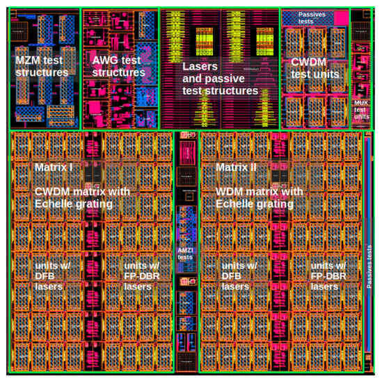 Mask layout of the reticle created in Nazca-Design, including two SiP matrix circuits for 4 wavelength CWDM and WDM, and test structures (top) of various components provided by the L3MATRIX designers. The fabrication was carried out at the AMS foundry; Detailed SEM images of the components are shown in Section 3.