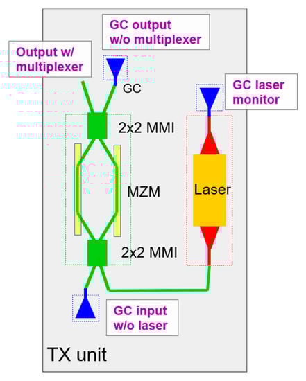 Transmitter cell layout for WDM and CWDM. The cell footprint is 1000 μm × 1750 μm. GC—Grating Coupler, MZM—Mach–Zehnder Modulator, MMI—Multimode Interference Coupler, w—with, w/o—without. The cell output with multiplexer from 4 cells is waveguided to an echelle grating multiplexer.