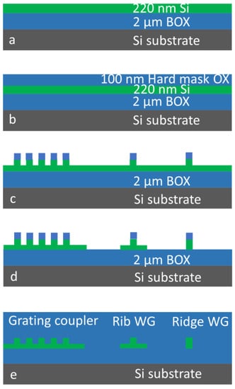We fabricated our SiP circuit on silicon-on-insulator (SOI) wafers in the AMS foundry. The top silicon layer of the SOI wafer was structured and modified by microelectronics manufacturing processing to create both passive and active photonic elements. The underlying bonding silicon dioxide layer (BOX) served as the bottom cladding of these light-guiding elements. The main steps of the passive device fabrication process are shown in Figure 6, which also describes the process used for the modulators. The fabrication process started with a thin layer of silicon dioxide deposited on the top silicon surface of the SOI wafer. Lithography and selective etching were then used to structure this layer, creating the hard mask that served for the subsequent partial silicon etching. This shallow silicon etching created rib devices (waveguides and grating couplers), as shown in Figure 6c. The next lithography step served to protect the shallow-etched areas and the subsequent selective silicon etching to remove all non-protected silicon. This selective etching step stopped on the underlaying bonding silicon dioxide, as shown in Figure 6d. A final silicon dioxide deposition step was used for upper cladding and planarization (Figure 6e), embedding the silicon structures. This relatively short process is part of the full PIC manufacturing process, and it is used for time-saving experiments on passive devices as well.