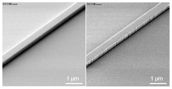 Waveguides are a core element of integrated photonic circuits. Their most important characteristic is their propagation loss, for which the dominant cause is the sidewall roughness [18]. This parameter is difficult to estimate and requires special conditions to observe. Figure 7 shows an SEM micrograph of the same view field inspected by different SEM detectors. Adjustment of the microscopy conditions enables correct detection and characterization of the sidewall roughness.