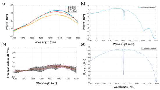 The sidewall roughness development starts from the lithography process and is transferred into the silicon by dry etching. Different types of the process could be used to reduce silicon waveguide sidewall roughness, such as photoresist reflow [19], more isotropic silicon etching [20], or sidewall roughness smoothing postprocessing [21]. In our manufacturing process, we used the latter-smoothing of completely etched waveguides by oven wet oxidation at 1050 °C to create 26 nm of thermal silicon dioxide. This process consumes 12 nm of silicon and sufficiently planarizes the sidewalls following its diffusion mode. The transmission loss measured on these passive devices is reduced from 7 dB/cm down to 1.5 dB/cm after applying this process (Figure 8a,b). In addition, the spectral noise clearly improved in all spectra. Moreover, as seen in Figure 8d,c, the slow-light waveguides (discussed in detail in Section 5) feature a much deeper band gap after thermal oxidation, which is a clear indication of the sidewall roughness reduction.