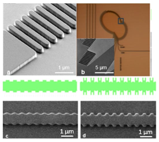 (a) Waveguide with a vertically modulated DBR and (b) optical micrograph of an Echelle grating. Inset—SEM of vertically modulated DBR in the selected square. (c,d) Waveguide with a lateral DFB grating. Top—layout and bottom—SEM micrographs show that OPC improves the corners of the lateral grid.