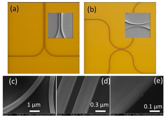 To fabricate the directional couplers, the same process as described in Section 3.1 was employed. Typical optical and SEM micrographs of the achieved couplers are depicted in Figure 10a,b. SEM analysis demonstrates that with the new optimized fabrication process, the sidewall roughness has been substantially reduced, even in the directional couplers bends, as shown in Figure 10c,e.