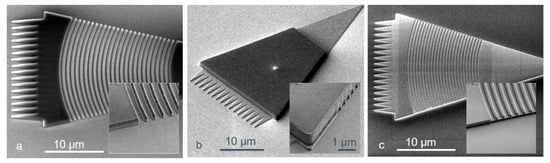 Our grating couplers were created by a two-step silicon etching process. The process steps are depicted in Figure 11: the first lithographic step defines the grating as well as the rib waveguides on the surface of the silicon dioxide hard mask. The etching includes a sequence of organic bottom antireflection coating (BARC), SiO2 hard mask and time-controlled 70-nm of Si etching (Figure 11a). Then the lithography for a second (complete) silicon etching is applied, and the photoresist protects the grating coupler area (Figure 11b) as well as the rib waveguides (not shown in these micrographs). The resulting two-step silicon structure on the bonding SiO2 surface can be seen in the inset of Figure 11c.