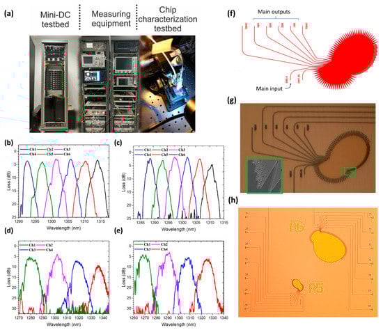 In order to assess the L3MATRIX system’s capabilities in more detail, we developed a specialized testbed to allow for characterization from a single component up to a system-level demonstration under realistic conditions. The testbed, depicted in Figure 12a, comprised FPGA boards with multiple high-speed RF and optical interfaces (SFP28/QSFP28) and servers with different network interfaces spanning from 10 Gb/s SFP+ up to 100 Gb/s QSFP28. In addition, commercial L2/L3 switches employing front-panel pluggable modules, along with miscellaneous testing equipment to interface with the L3MATRIX technology. Figure 12b–e depicts indicative experimental results from L3MATRIX final demonstrator devices. As already described, the development of our interconnection scheme requires all-optical multiplexers and demultiplexers, such as Echelle gratings [22]. To this end, 2 × 6 and 2 × 4 Echelle grating structures have been included in the fabricated chip of Figure 4, and both have been measured in our testing and characterization testbed, revealing the corresponding channel response of Figure 12b–e, respectively. The channels of the two Echelle gratings are following a Gaussian response, with the channel spacing being 4 nm and 20 nm for the 2 × 6 and 2 × 4 configurations, respectively. Further details for our Echelle structures are shown in Figure 12f–h, including the layout and two optical micrographs. The inset of Figure 12g shows an SEM image of the region of the Echelle grating that is indicated by the respective green rectangle.