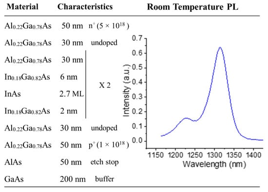 The epitaxial structure of the optimized QD laser stack with a total III–V thickness of 236 nm and room temperature PL. For the InAs QDs layer thickness, ML denotes monolayers.