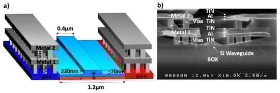 The L3MATRIX integrated transmitter includes electro-optic (E/O) modulators that must be simultaneously compact, high-speed, and ultimately low power to match the ASIC’s output voltage. Moreover, the fabrication process must be kept simple and robust, ensuring that the design rules of a standard CMOS platform, providing commercial electronic integrated circuits (EICs), are met. For these reasons, the active modulator region is a vertical pn junction (Figure 15) that produces a larger effective index change than horizontal (lateral) ones [40]. In addition to their versatility, vertical designs are less sensitive to fabrication variations than conventional ones [41]. L3MATRIX modulators also benefit from the high tolerance to mask alignment inaccuracies because their fabrication depends on the implantation energy rather than lithography resolution. Early vertical pn junctions were based on doped polysilicon deposition [42], which is readily available in standard CMOS processing lines. It is, however, a lossy material. More recently, a “U-shaped” pn junction was demonstrated [43], exhibiting high modulation efficiencies of 4.6 V.mm and 2.6 V.mm at a low voltage at a −0.5 V bias. However, its formation relies on several low-medium energy implantation steps that must be precisely aligned with respect to one another, increasing the overall cost of the process. Moreover, implantation at 0° tilt (instead of 7°) dramatically increases Boron channeling and, hence, decreases the control on the vertical positioning of the junction, which may affect the robustness of the process when the number of fabricated devices scales up. The modulator fabrication was entirely performed in the AMS CMOS foundry (Figure 6) with 248 nm DUV lithography. Most notably, the 1.2 µm wide pn junction was formed with only one mask, reducing simultaneously the cost and the impact of potential alignment errors. Phosphorus (P) was implanted with an energy of 150 keV and a dose reaching 5 × 1013 cm−3 to form the n-type region. BF3 (BF2+) implantation, at 100 keV energy and 4 × 1013 cm−3 dose, was used for the p-type region to benefit from its shallow implantation profile. The p++ and n++ regions were formed with a shallow 20 keV implant with a 1e15 cm−3 dose. The wafer was then annealed for 10 s at 1000 °C in an inert argon (Ar) environment. The high-speed electrodes consist of standard CMOS stacked bi-layers of 500 nm aluminum and 150 nm TiN (anti-reflective coating) (M1 and M2 in Figure 15a,b) interconnected with tungsten (W) vias. The Metal (TiN liner, W)-semiconductor (Ti-Si) silicidation together with the heavily doped p++ and n++ regions led to very low contact resistance, making high-speed operation possible. The travelling wave electrodes design was carried out with HFSS to maximize the overlap and relative speeds of the co-propagating optical and electrical signals. Optimal ohmic contacts between the W vias and the SOI region were achieved using a 1 × 1015 cm−3 dose and a shallow 20 keV implant to form the p++ and n++ regions.