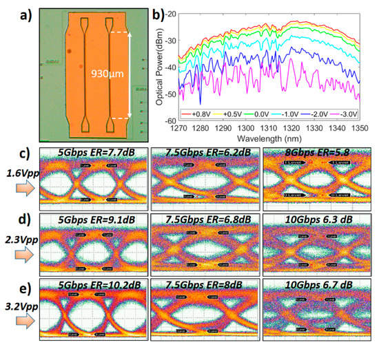 (a) An optical micrograph of the push-pull modulator and (b) DC characterization results. The extinction ratio is >10 dB across 1270-1350 nm range and NRZ OOK eyes diagrams with (c) 1.6 Vpp, (d) 2.3 Vpp and (e) 3.2 Vpp in a differential driving scheme (the drive voltage applied on each arm).