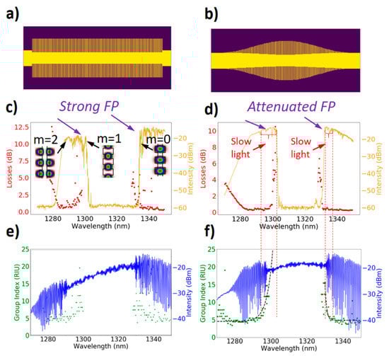 Pictures of the tapered fast-to-slow-light transitions defined by three different apodization functions: (a) no fast-to-slow light transition (standard slow light waveguide) and (b) Blackman function. (c,d) optical transmission vs. wavelength (light brown plain line), losses vs. wavelength (red dots). (e,f) Mach–Zehnder Interferometer spectra (blue plain line) from which the group index variations vs. wavelength (exp. data: green dots and fit: dashed black line) are extracted.