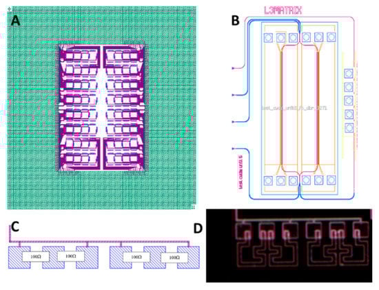Chiplet mimic interposer (A) showing the SiP assembly area in purple and the package assembly area in green. A single interposer cell is shown in (B) with the bumps over the SiP transmit cell. The 100-ohm termination design for the modulator is shown in (C); the resulting silicon is in (D).