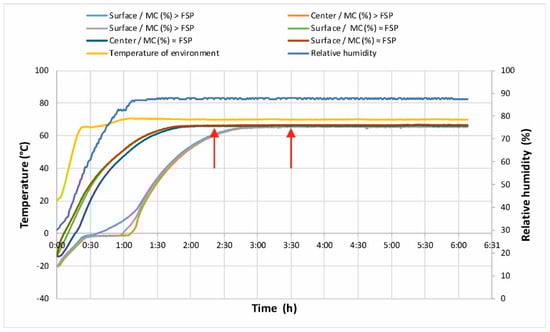 For the second group of samples (MC > FSP), the heating process was divided into three stages similar to those described in the sample freezing process. The initial temperature of the samples was lower (−20 °C), and the duration of the first stage, when the temperature rise in the middle of the samples stopped, was 30 min. Temperature differences in wood cross-sections were minimal. The second stage, when the water level in the wood changed from solid to liquid, was 40 min. The difference in temperature at the surface and n the middle of the samples was measured. In the third stage, the samples were heated with a small temperature drop in the cross-section. The time to reach the desired temperature of 65 °C in the middle of the samples was approximately 2 h 20 min. The total time to defrost and heat this group of samples was 3 h 30 min.