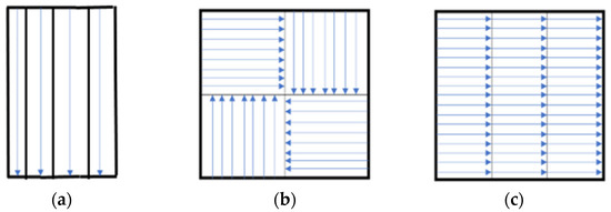 Considering the material deposition manner, the manuscript targets to provide a material deposition strategy to achieve the in-plane isotropy, ultimately improving the mechanical strength. Existing techniques in improving mechanical strength regarding altering toolpath can be classified as bio-inspired structures and non-planar toolpaths. Bio-inspired structures such as honeycomb [14], cross-linked [15], and Bouligand structures [16,17] have been studied to improve mechanical properties. In addition, the other strategies by altering the toolpath to reduce the in-plane anisotropic property caused by longitudinal filament are shown in Figure 2. These strategies are mostly adopted in metal AM processes for reducing the thermal distortion by evenly distributing the heat. However, the continuity of the in-plane filament cannot be maintained through these.